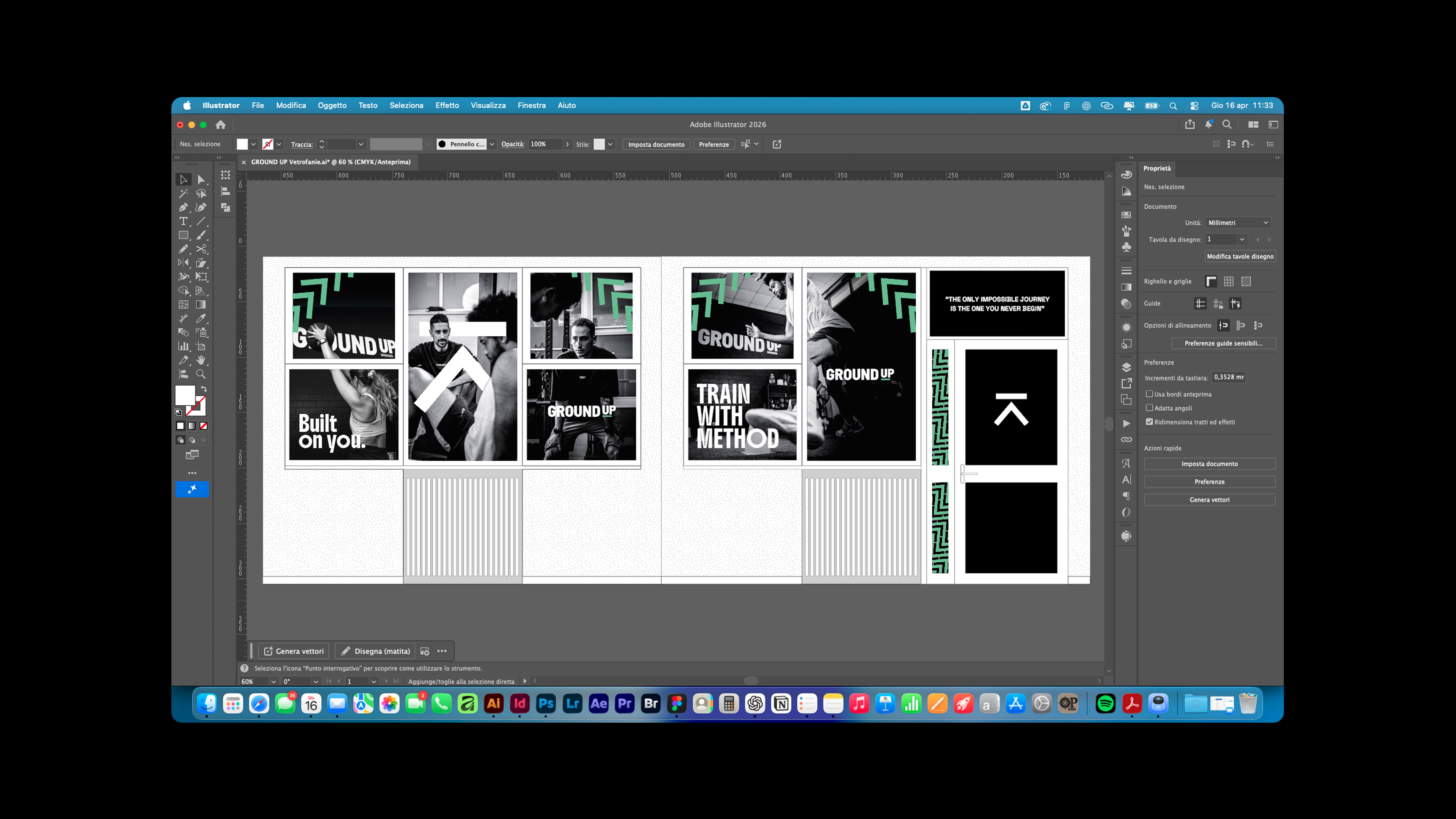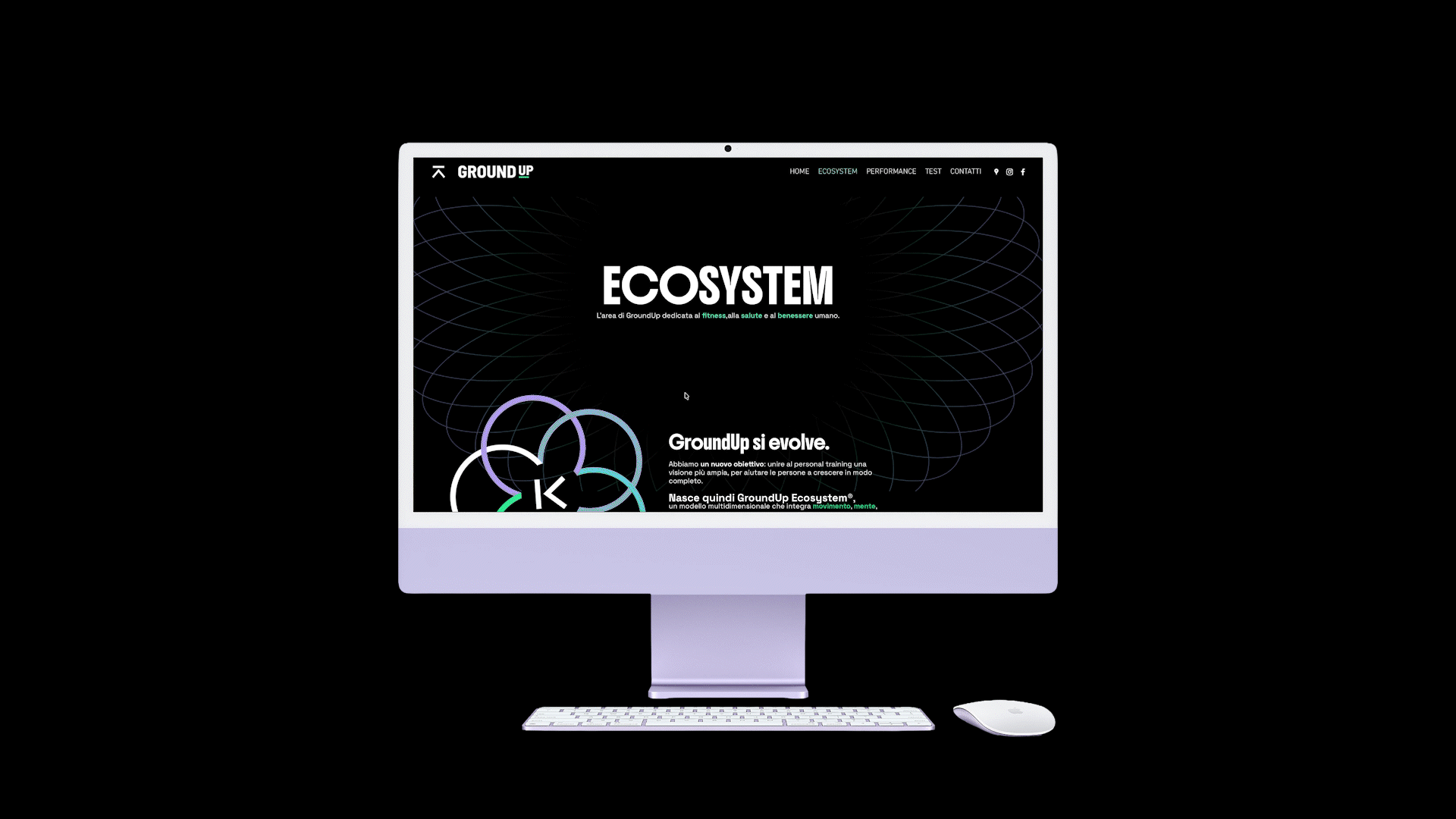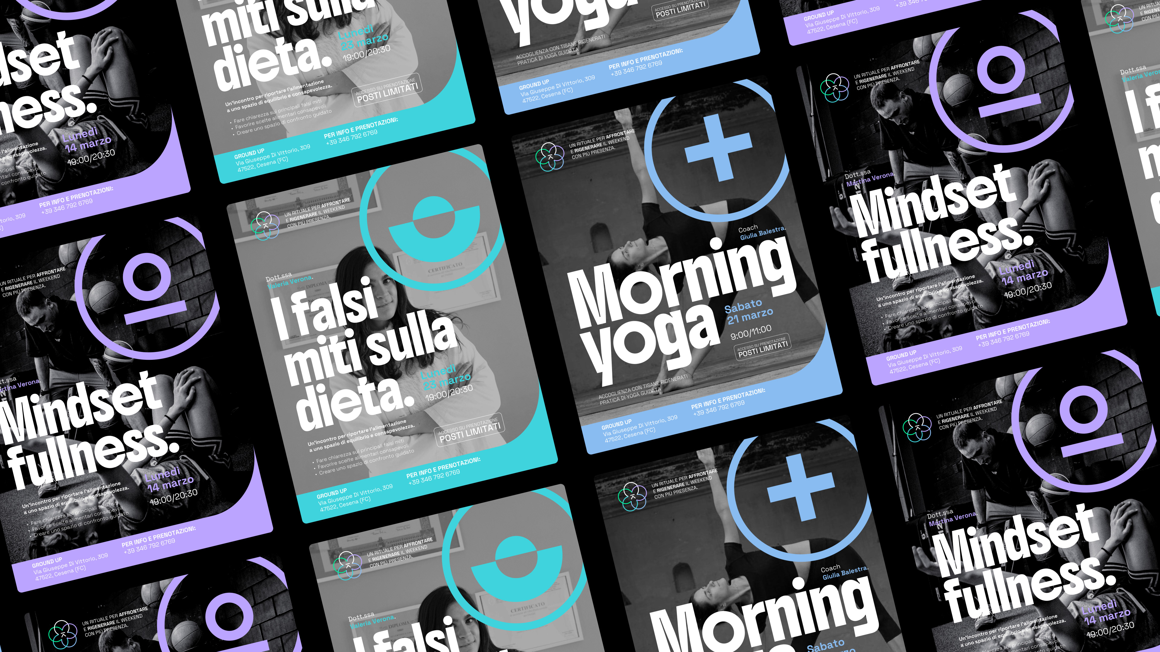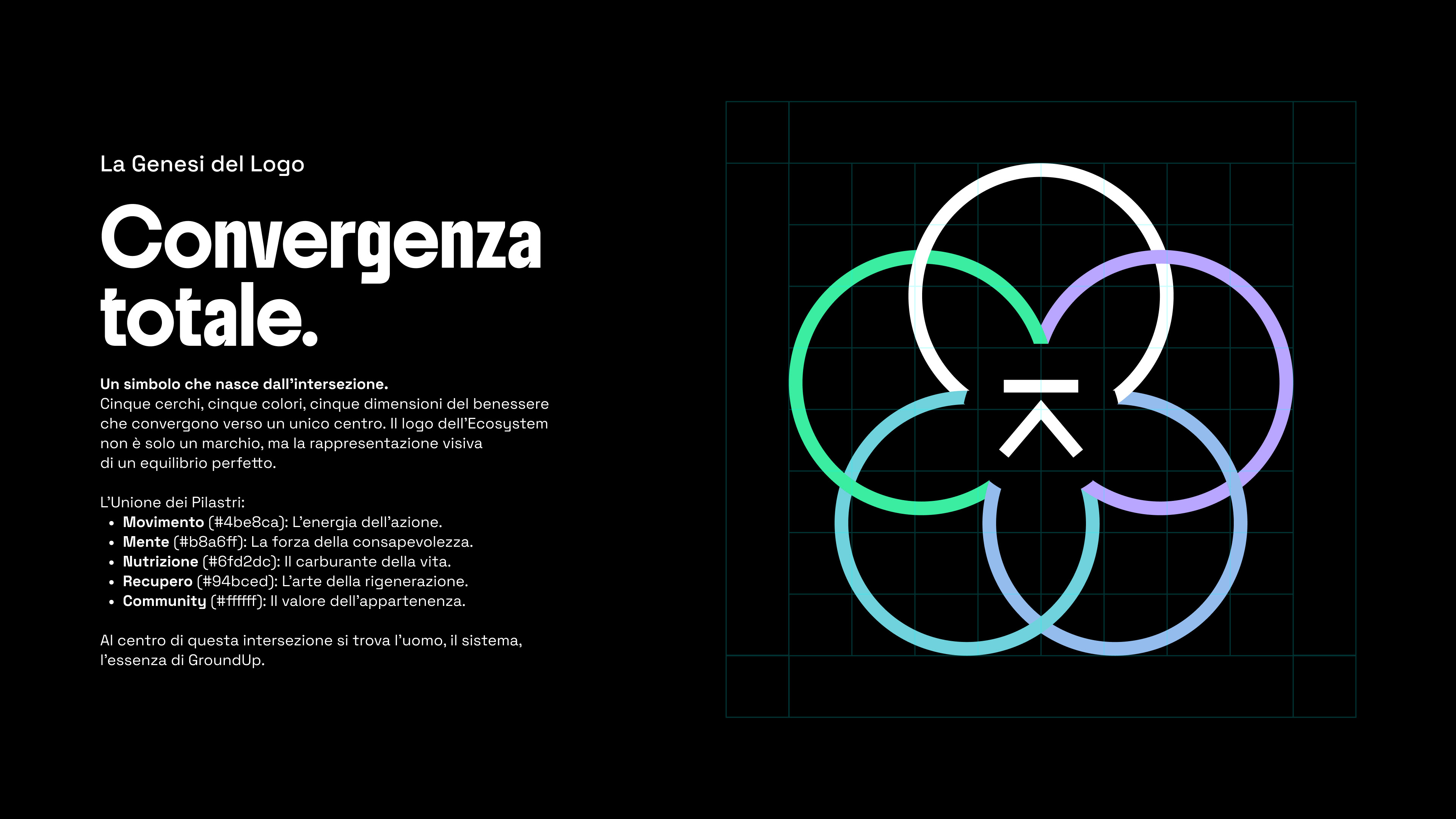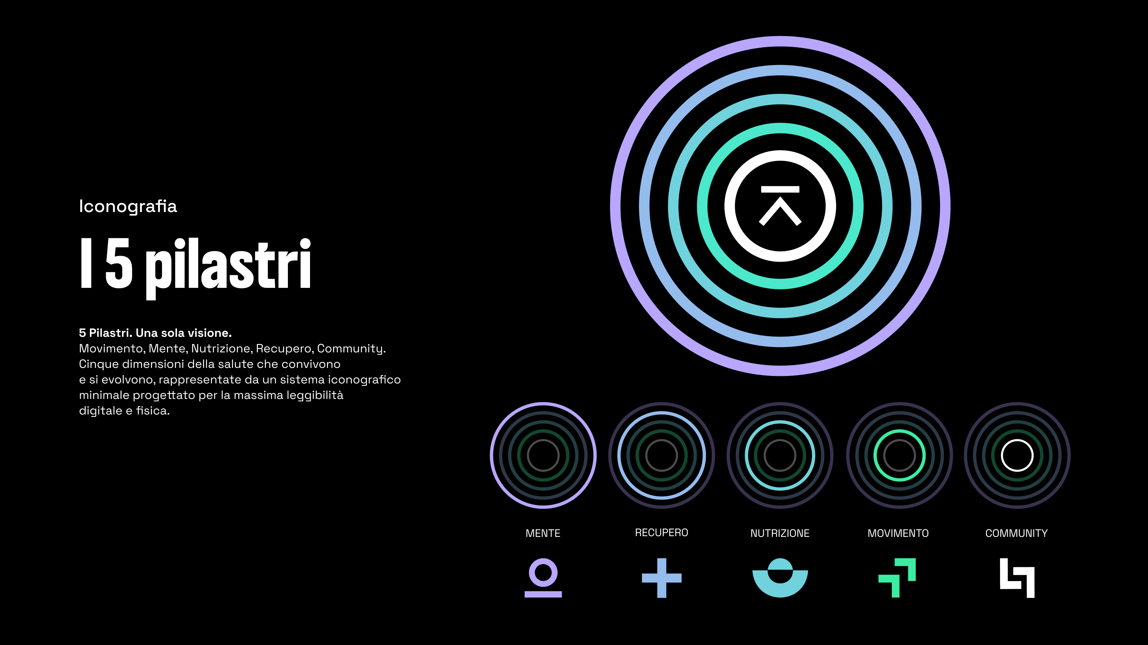 Il progetto ha previsto lo sviluppo di un linguaggio iconografico proprietario basato su 5 pilastri (Movimento, Mente, Nutrizione, Recupero, Community), che convergono nel simbolo centrale dell'ecosistema. Dalle interfacce UI del sito web fino alla materialità delle vetrofanie e all'impaginazione di presentazioni e format editoriali, ogni touchpoint è stato studiato per restituire un'esperienza immersiva e coerente.