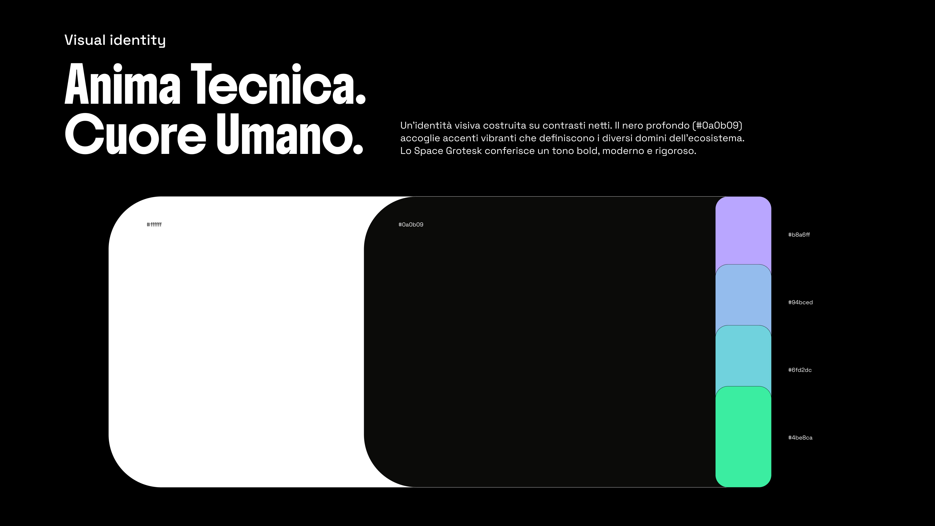 il rigore del nero assoluto unito a una palette di tinte fluo e vibranti. L'uso massiccio del font Space Grotesk conferisce un tono clinico ma contemporaneo, perfetto per unire l'anima tecnica a quella umana del brand.